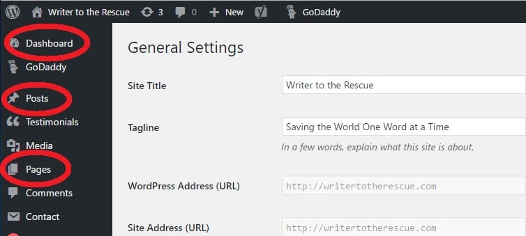 Once you are logged in, you will arrive at a page called “Dashboard.” The Dashboard is the control panel of the website. This is where you create and manage your content and see an overview of the details of your website. You have access to important menu options, like Posts and Pages, in the sidebar.